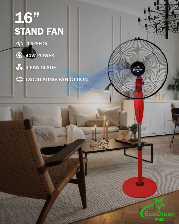 The Ecogreen 16-inch stand fan is an excellent blend of style and functionality, available in three attractive White. This versatile fan offers three-speed options, allowing you to tailor the airflow to your comfort needs. Operating on a 220V~50Hz power supply with a 40W power consumption, it is both energy-efficient and powerful.